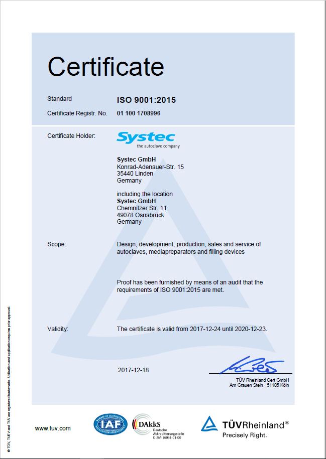 Systec GmbH & Co. KG 成立于1994年,是專業(yè)從事高壓滅菌設(shè)備(蒸汽滅菌器)研發(fā)與制造的企業(yè),核心產(chǎn)品涵蓋實(shí)驗(yàn)室級(jí)高壓滅菌器、培養(yǎng)基制備系統(tǒng)以及液體培養(yǎng)基與微生物培養(yǎng)基分裝裝置。公司通過ISO 9001質(zhì)量管理體系及ISO 14001環(huán)境管理體系雙重認(rèn)證,致力于為現(xiàn)代實(shí)驗(yàn)室、科研機(jī)構(gòu)以及生物技術(shù)、制藥、質(zhì)量控制和工業(yè)生產(chǎn)領(lǐng)域提供多元化產(chǎn)品組合。Systec高壓滅菌設(shè)備在全球市場(chǎng)擁有逾30年成熟應(yīng)用經(jīng)驗(yàn),既作為實(shí)驗(yàn)室級(jí)滅菌設(shè)備服務(wù)于科研領(lǐng)域,也作為工業(yè)級(jí)滅菌設(shè)備(例如制藥工業(yè)中的生產(chǎn)型滅菌設(shè)備或食品工業(yè)滅菌解決方案)在工業(yè)化生產(chǎn)場(chǎng)景中實(shí)現(xiàn)高效滅菌工藝,其技術(shù)可靠性和流程合規(guī)性已獲得國(guó)際制藥與食品生產(chǎn)行業(yè)的廣泛認(rèn)可。